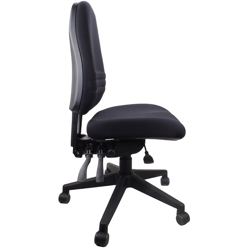 Fully ergonomic and has a 4 lever mechanism. Seat slide and a five-star base on castors. The luxurious moulded foam seat and triple strip lumbar support back ensure comfort. Level 6 AFRDI rating and is BIFMA tested. Adjustable arms are available as an additional extra. Ratchet back. AFRDI load rated to 160 Kg. Chair Dimensions: Seat 510W x 480D x Back 550H x Seat 490-555mmH. 10 Year Manufacturer's Warranty. Optional adjustable armrest available. Refer to product code 2834421.