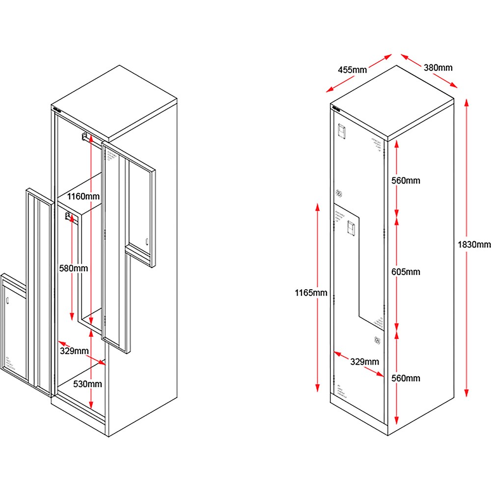 Comes assembled. Allows full hanging space to each compartment. Riveted construction. Full length door stiffeners. Cam Lock with 2 keys. Coat rail in each compartment. Ventilation on door. 10 Year Manufacturer's Warranty.