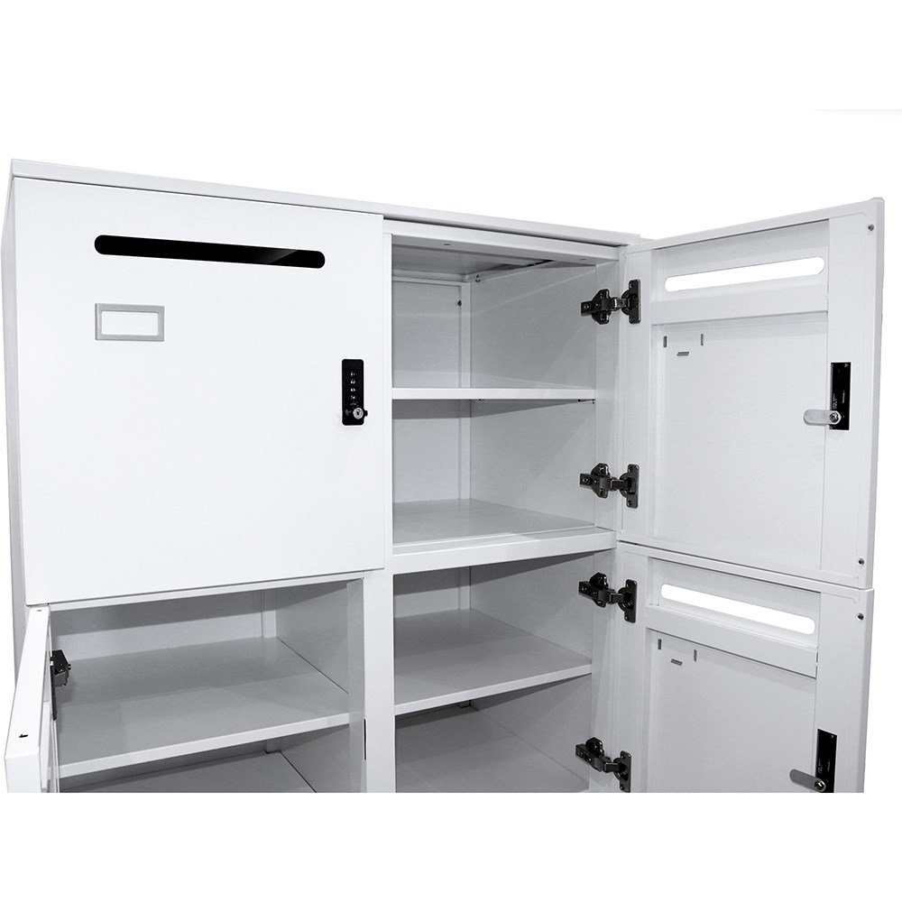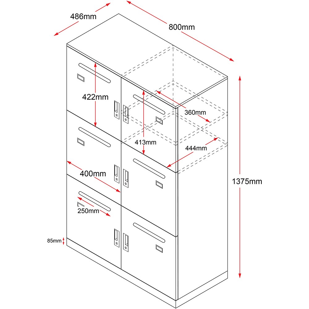 6 lockable individual compartments . Mail or document slot and adjustable shelf . Name tag holder fitted to each door. Powder coated finish. 4 digit combination lock fitted to each door with both private and public functions. 1 x master key provided with each unit. Individual locker size 360W x 470D x 420mmH. Unit Dimension: 800W x 486D x 1375mmH. 10 Year Manufacturer's Warranty.