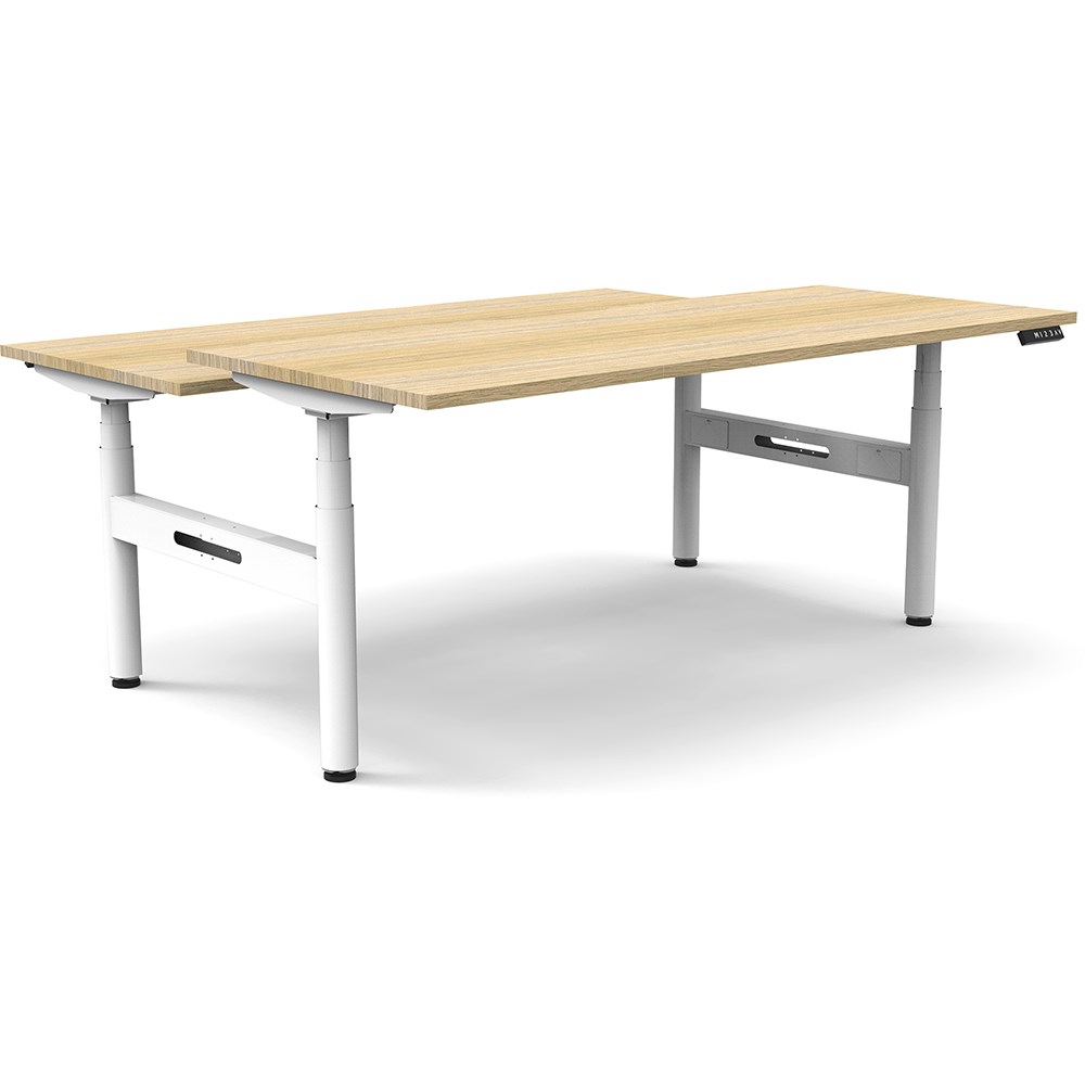 Natural Oak top with White frame. Unit Dimension: 1500mm W x 1500mm D x 620-1270mm H. 750mm depth per user. E0 rated top. Powdercoat base. Digital control panel with 3 pre-set positions, LED display panel, keypad safety lock & reminder alarm setting. Anti-collision technology, noise emission of less than 50DB. Lifting capacity of 120kg with a max speed of 38mm per second. 70mm diameter round column legs. 700mm wide foot size with adjustable leveling feet, return foot: 700mm. 10 Year Manufacturer's Warranty. Delivery, installation and assembly charges may apply to furniture. Please enquire to confirm.