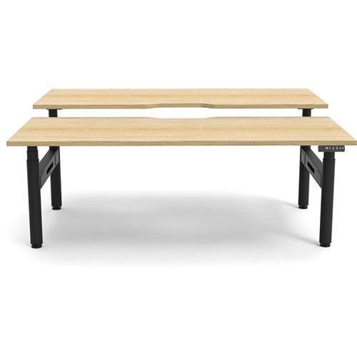 Natural Oak top with Black frame. Unit Dimension: 1800mm W x 1500mm D x 620-1270mm H. 750mm depth per user. E0 rated top. Powdercoat base. Digital control panel with 3 pre-set positions, LED display panel, keypad safety lock & reminder alarm setting. Anti-collision technology, noise emission of less than 50DB. Lifting capacity of 120kg with a max speed of 38mm per second. 70mm diameter round column legs. 700mm wide foot size with adjustable leveling feet, return foot: 700mm. 10 Year Manufacturer's Warranty. Delivery, installation and assembly charges may apply to furniture. Please enquire to confirm.