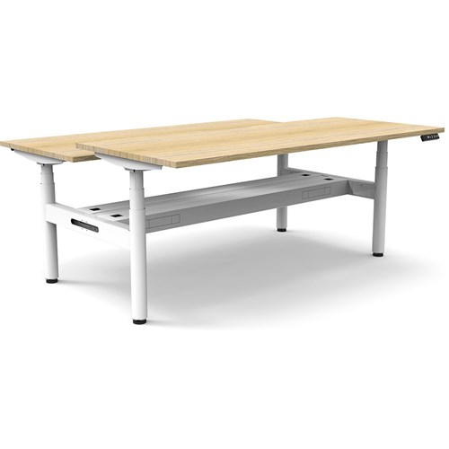 Natural Oak top with White frame. Unit Dimension: 1500mm W x 1500mm D x 620-1270mm H. 750mm depth per user. E0 rated top. Powdercoat base. Digital control panel with 3 pre-set positions, LED display panel, keypad safety lock & reminder alarm setting. Anti-collision technology, noise emission of less than 50DB. Lifting capacity of 120kg with a max speed of 38mm per second. 70mm diameter round column legs. 700mm wide foot size with adjustable leveling feet, return foot: 700mm. Comes with cable tray for cable management. 10 Year Manufacturer's Warranty. Delivery, installation and assembly charges may apply to furniture. Please enquire to confirm.