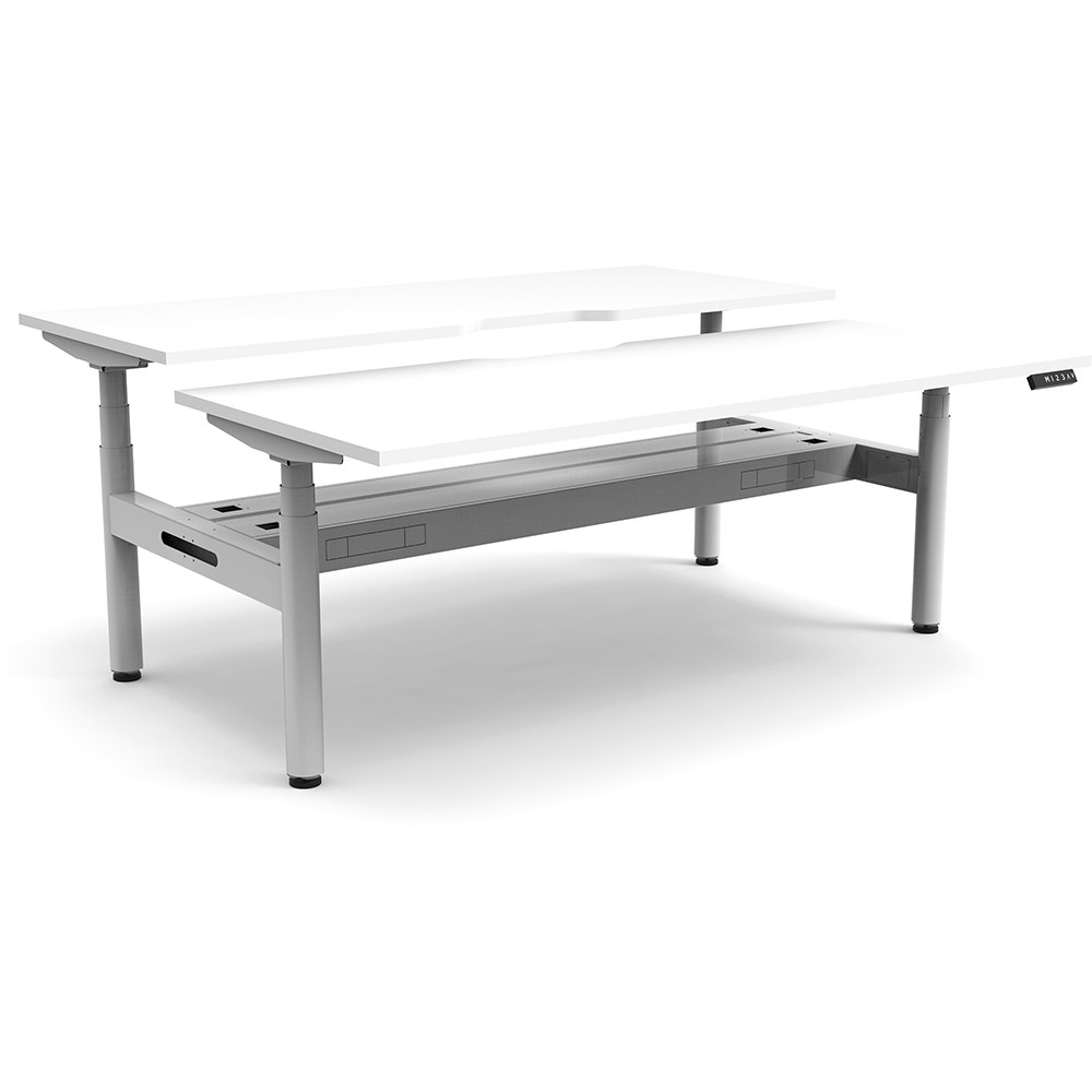 White top with White frame. Unit Dimension: 1500mm W x 1500mm D x 620-1270mm H. 750mm depth per user. E0 rated top. Powdercoat base. Digital control panel with 3 pre-set positions, LED display panel, keypad safety lock & reminder alarm setting. Anti-collision technology, noise emission of less than 50DB. Lifting capacity of 120kg with a max speed of 38mm per second. 70mm diameter round column legs. 700mm wide foot size with adjustable leveling feet, return foot: 700mm. Comes with cable tray for cable management. 10 Year Manufacturer's Warranty. Delivery, installation and assembly charges may apply to furniture. Please enquire to confirm.
