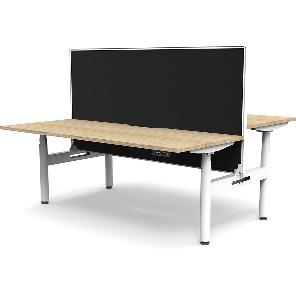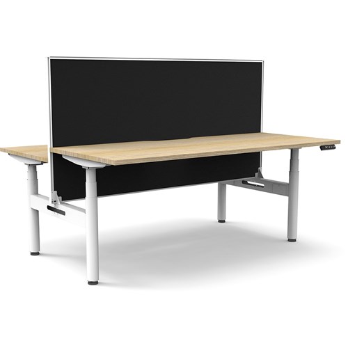 Natural Oak top with White frame. Unit Dimension: 1800mm W x 1500mm D x 1330mm H. 620-1270mm height range for desk, 750mm depth per user. E0 rated top. Powdercoat base. Digital control panel with 3 pre-set positions, LED display panel, keypad safety lock & reminder alarm setting. Anti-collision technology, noise emission of less than 50DB. Lifting capacity of 120kg with a max speed of 38mm per second. 70mm diameter round column legs. 700mm wide foot size with adjustable leveling feet, return foot: 700mm. Comes with 30mm thick privacy screen. 10 Year Manufacturer's Warranty. Delivery, installation and assembly charges may apply to furniture. Please enquire to confirm.
