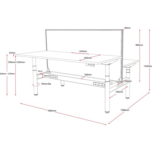 White top with Black frame. Unit Dimension: 1800mm W x 1500mm D x 1330mm H. 620-1270mm height range for desk, 750mm depth per user. E0 rated top. Powdercoat base. Digital control panel with 3 pre-set positions, LED display panel, keypad safety lock & reminder alarm setting. Anti-collision technology, noise emission of less than 50DB. Lifting capacity of 120kg with a max speed of 38mm per second. 70mm diameter round column legs. 700mm wide foot size with adjustable leveling feet, return foot: 700mm. Comes with 30mm thick privacy screen. 10 Year Manufacturer's Warranty. Delivery, installation and assembly charges may apply to furniture. Please enquire to confirm.