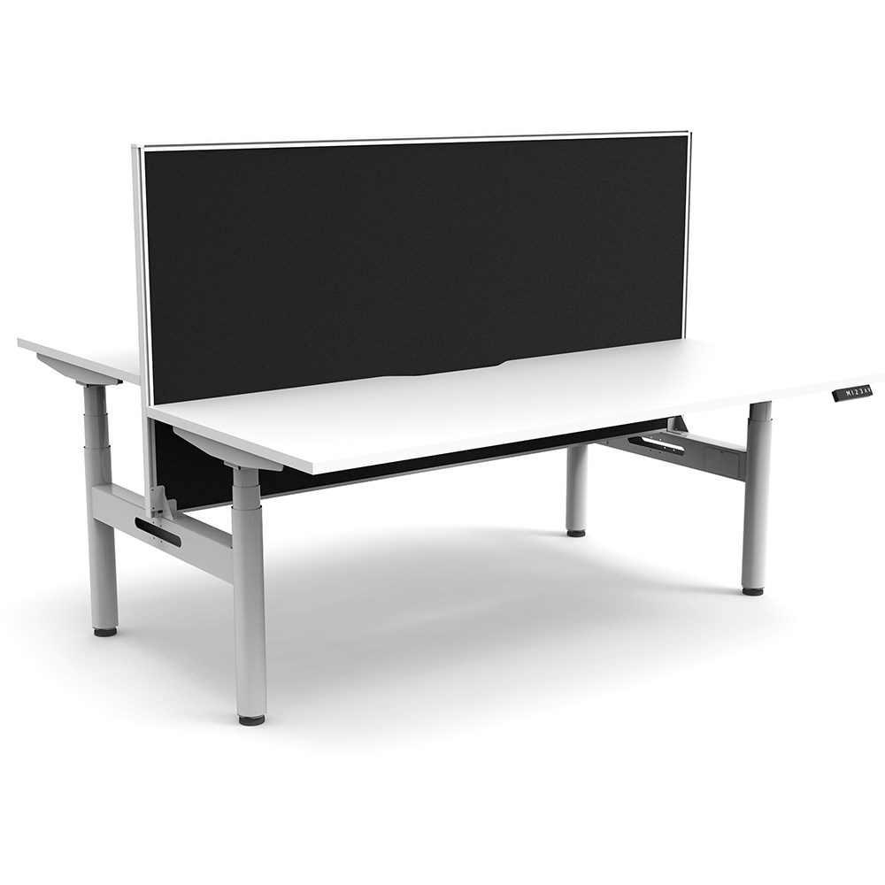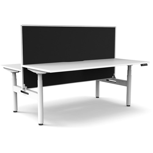 White top with White frame. Unit Dimension: 1800mm W x 1500mm D x 1330mm H. 620-1270mm height range for desk, 750mm depth per user. E0 rated top. Powdercoat base. Digital control panel with 3 pre-set positions, LED display panel, keypad safety lock & reminder alarm setting. Anti-collision technology, noise emission of less than 50DB. Lifting capacity of 120kg with a max speed of 38mm per second. 70mm diameter round column legs. 700mm wide foot size with adjustable leveling feet, return foot: 700mm. Comes with 30mm thick privacy screen. 10 Year Manufacturer's Warranty. Delivery, installation and assembly charges may apply to furniture. Please enquire to confirm.