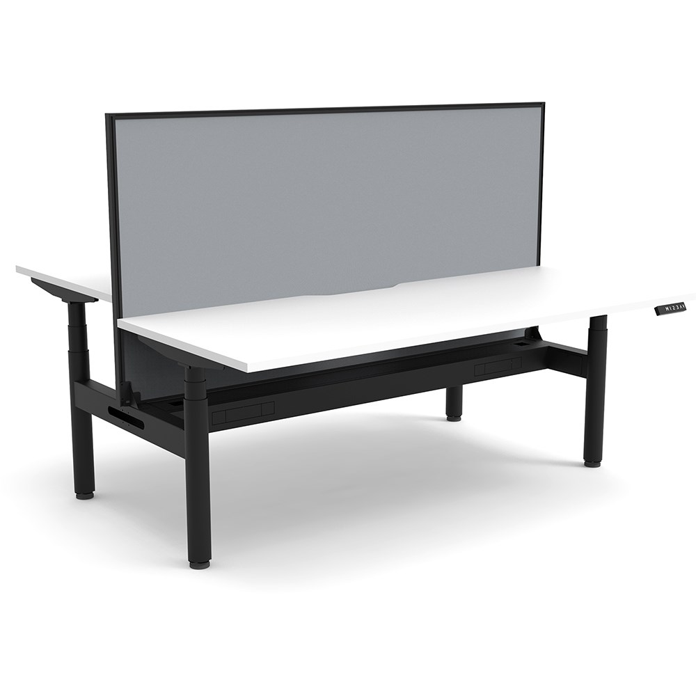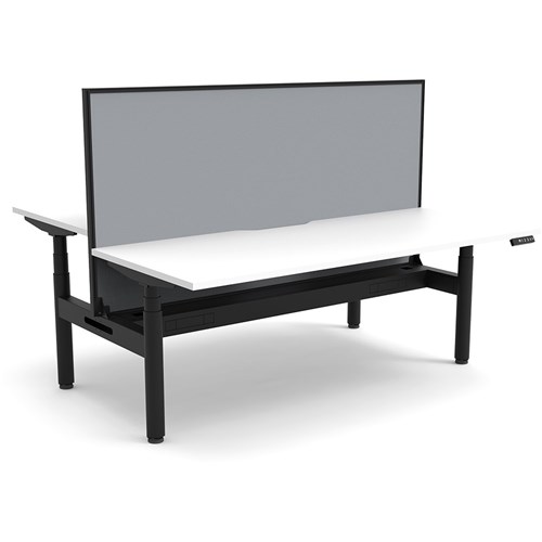 White top with Black frame. Unit Dimension: 1200mm W x 1500mm D x 1330mm H. 620-1270mm height range for desk, 750mm depth per user. E0 rated top. Powdercoat base. Digital control panel with 3 pre-set positions, LED display panel, keypad safety lock & reminder alarm setting. Anti-collision technology, noise emission of less than 50DB. Lifting capacity of 120kg with a max speed of 38mm per second. 70mm diameter round column legs. 700mm wide foot size with adjustable leveling feet, return foot: 700mm. Comes with 30mm thick privacy screens and cable tray for cable management. 10 Year Manufacturer's Warranty. Delivery, installation and assembly charges may apply to furniture. Please enquire to confirm.