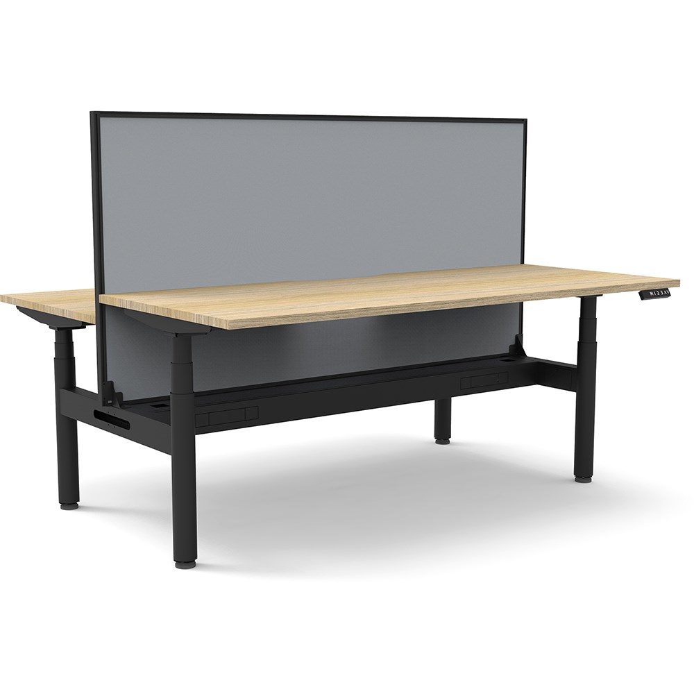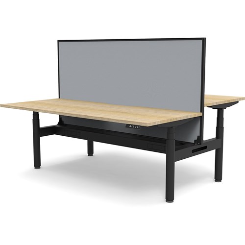 Natural Oak top with Black frame. Unit Dimension: 1800mm W x 1500mm D x 1330mm H. 620-1270mm height range for desk, 750mm depth per user. E0 rated top. Powdercoat base. Digital control panel with 3 pre-set positions, LED display panel, keypad safety lock & reminder alarm setting. Anti-collision technology, noise emission of less than 50DB. Lifting capacity of 120kg with a max speed of 38mm per second. 70mm diameter round column legs. 700mm wide foot size with adjustable leveling feet, return foot: 700mm. Comes with 30mm thick privacy screens and cable tray for cable management. 10 Year Manufacturer's Warranty. Delivery, installation and assembly charges may apply to furniture. Please enquire to confirm.