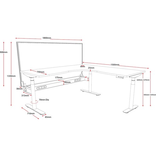 Natural Oak top with Black frame. Unit Dimension: 1800/1500mm W x 750mm D x 1330mm H. 620-1270mm height range for desk. E0 rated top. Powdercoat base. Digital control panel with 3 pre-set positions, LED display panel, keypad safety lock & reminder alarm setting. Anti-collision technology, noise emission of less than 50DB. Lifting capacity of 120kg with a max speed of 38mm per second. 70mm diameter round column legs. 700mm wide foot size with adjustable leveling feet, return foot: 700mm. Comes with 30mm thick privacy screen. 10 Year Manufacturer's Warranty. Delivery, installation and assembly charges may apply to furniture. Please enquire to confirm.
