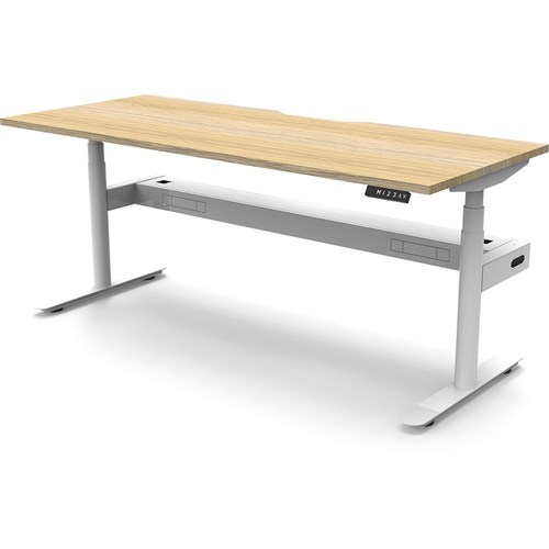Natural Oak top with White frame. Unit Dimension: 1200mm W x 750mm D x 620-1270mm H. Comes with cable tray for cable management. E0 rated top. Powdercoat base. Digital control panel with 3 pre-set positions, LED display panel, keypad safety lock & reminder alarm setting. Anti-collision technology, noise emission of less than 50DB. Lifting capacity of 120kg with a max speed of 38mm per second. 70mm diameter round column legs. 700mm wide foot size with adjustable leveling feet, return foot: 700mm. Comes with cable tray for cable management. 10 Year Manufacturer's Warranty. Delivery, installation and assembly charges may apply to furniture. Please enquire to confirm.