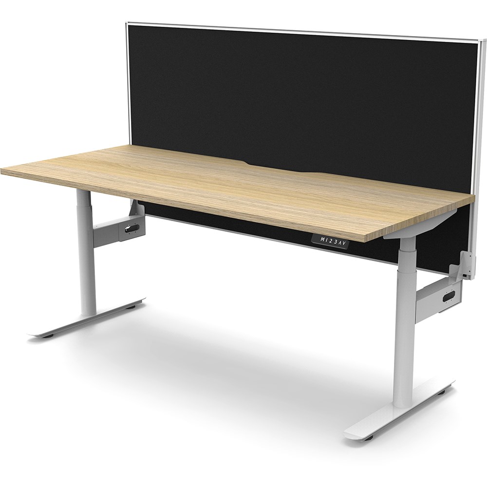 Natural Oak top with White frame. Unit Dimension: 1800mm W x 750mm D x 1330mm H. 620-1270mm height range for desk. E0 rated top. Powdercoat base. Digital control panel with 3 pre-set positions, LED display panel, keypad safety lock & reminder alarm setting. Anti-collision technology, noise emission of less than 50DB. Lifting capacity of 120kg with a max speed of 38mm per second. 70mm diameter round column legs. 700mm wide foot size with adjustable leveling feet, return foot: 700mm. Comes with 30mm thick privacy screen. 10 Year Manufacturer's Warranty. Delivery, installation and assembly charges may apply to furniture. Please enquire to confirm.