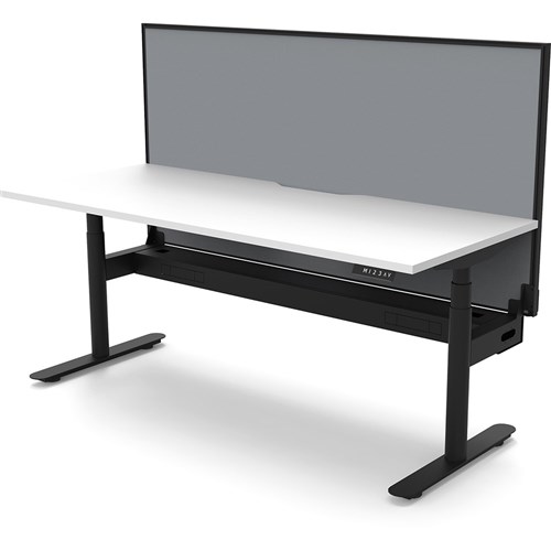 White top with Black frame. Unit Dimension: 1200mm W x 750mm D x 1330mm H. 620-1270mm height range for desk. E0 rated top. Powdercoat base. Digital control panel with 3 pre-set positions, LED display panel, keypad safety lock & reminder alarm setting. Anti-collision technology, noise emission of less than 50DB. Lifting capacity of 120kg with a max speed of 38mm per second. 70mm diameter round column legs. 700mm wide foot size with adjustable leveling feet, return foot: 700mm. Comes with 30mm thick privacy screens and cable tray for cable management. 10 Year Manufacturer's Warranty. Delivery, installation and assembly charges may apply to furniture. Please enquire to confirm.