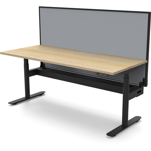 Natural Oak top with Black frame. Unit Dimension: 1500mm W x 750mm D x 1330mm H. 620-1270mm height range for desk. E0 rated top. Powdercoat base. Digital control panel with 3 pre-set positions, LED display panel, keypad safety lock & reminder alarm setting. Anti-collision technology, noise emission of less than 50DB. Lifting capacity of 120kg with a max speed of 38mm per second. 70mm diameter round column legs. 700mm wide foot size with adjustable leveling feet, return foot: 700mm. Comes with 30mm thick privacy screens and cable tray for cable management. 10 Year Manufacturer's Warranty. Delivery, installation and assembly charges may apply to furniture. Please enquire to confirm.