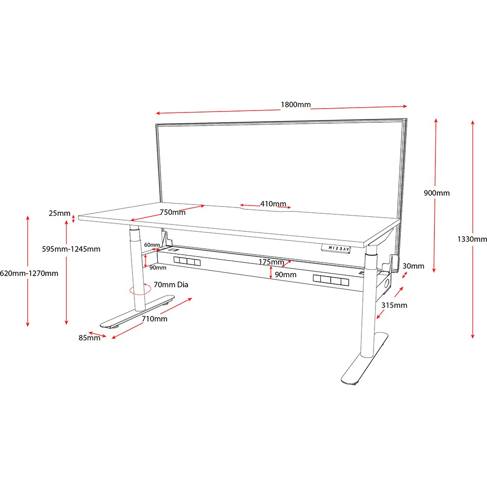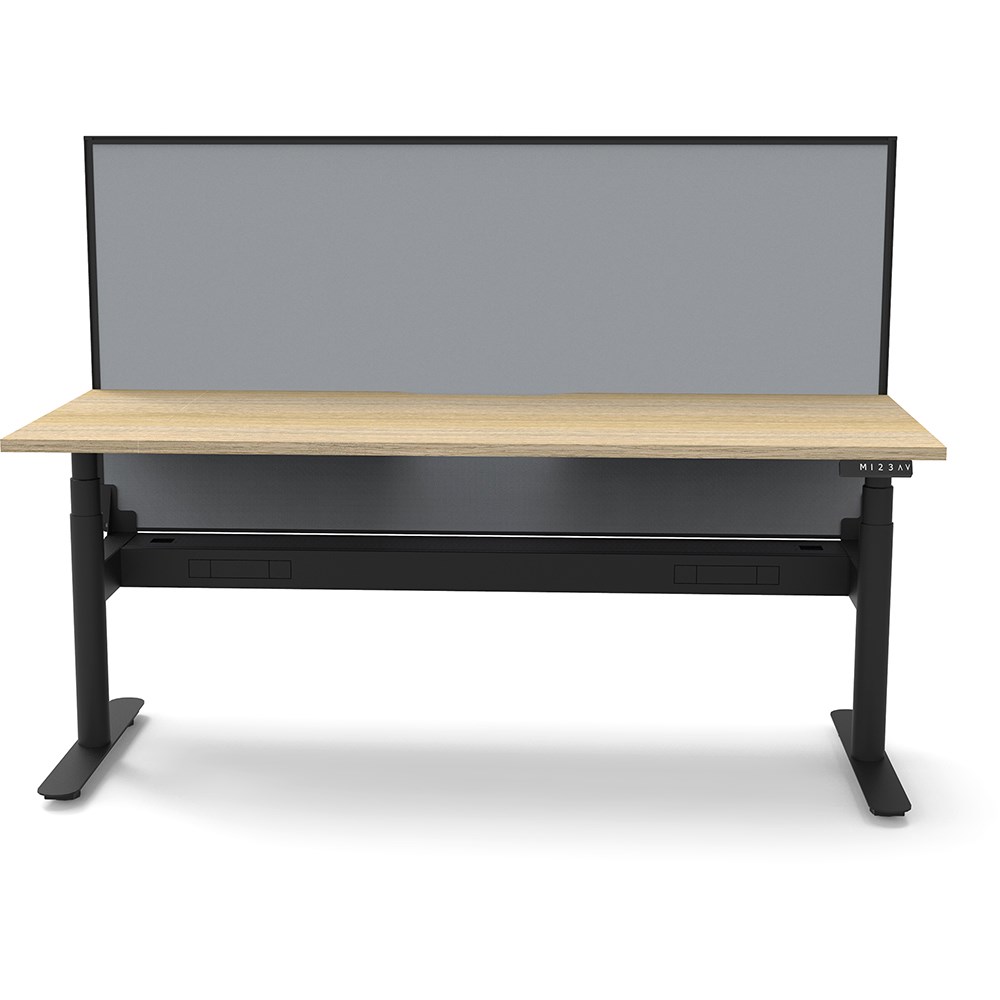 Natural Oak top with Black frame. Unit Dimension: 1800mm W x 750mm D x 1330mm H. 620-1270mm height range for desk. E0 rated top. Powdercoat base. Digital control panel with 3 pre-set positions, LED display panel, keypad safety lock & reminder alarm setting. Anti-collision technology, noise emission of less than 50DB. Lifting capacity of 120kg with a max speed of 38mm per second. 70mm diameter round column legs. 700mm wide foot size with adjustable leveling feet, return foot: 700mm. Comes with 30mm thick privacy screens and cable tray for cable management. 10 Year Manufacturer's Warranty. Delivery, installation and assembly charges may apply to furniture. Please enquire to confirm.