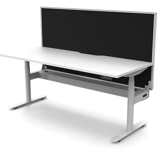 White top with White frame. Unit Dimension: 1800mm W x 750mm D x 1330mm H. 620-1270mm height range for desk. E0 rated top. Powdercoat base. Digital control panel with 3 pre-set positions, LED display panel, keypad safety lock & reminder alarm setting. Anti-collision technology, noise emission of less than 50DB. Lifting capacity of 120kg with a max speed of 38mm per second. 70mm diameter round column legs. 700mm wide foot size with adjustable leveling feet, return foot: 700mm. Comes with 30mm thick privacy screens and cable tray for cable management. 10 Year Manufacturer's Warranty. Delivery, installation and assembly charges may apply to furniture. Please enquire to confirm.