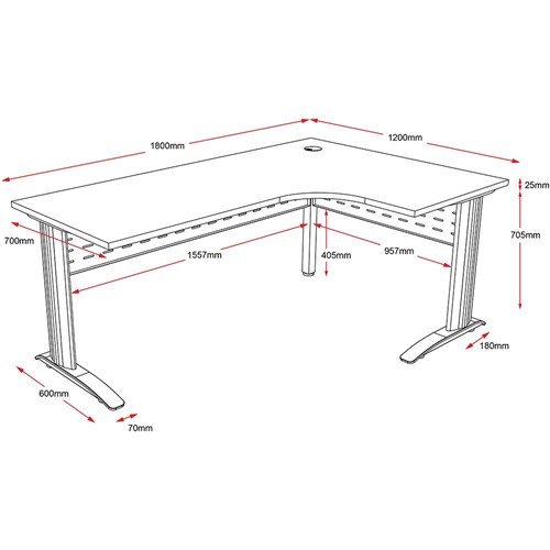 One piece corner workstation with 25mm top. Sturdy powder coated frame and legs. Comes with metal perforated modesty panel and cable tidy. E0 Enviroboard top. 1 x 80mm cable entry hole in corner of top. Adjustable feet. 5 Years Manufacturer's Warranty. Delivery, installation and assembly charges may apply to furniture. Please enquire to confirm.