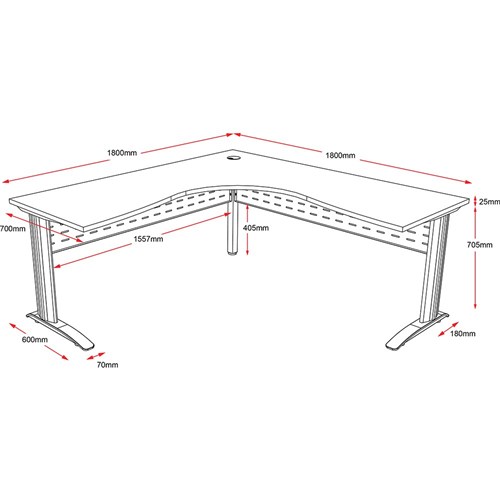 Natural White top and White frame. One piece corner workstation with 25mm top. Sturdy powder coated frame and legs. Comes with metal perforated modesty panel and cable tidy. E0 Enviroboard top. 1 x 80mm cable entry hole in corner of top. Adjustable feet. 5 Years Manufacturer's Warranty. Delivery, installation and assembly charges may apply to furniture. Please enquire to confirm.