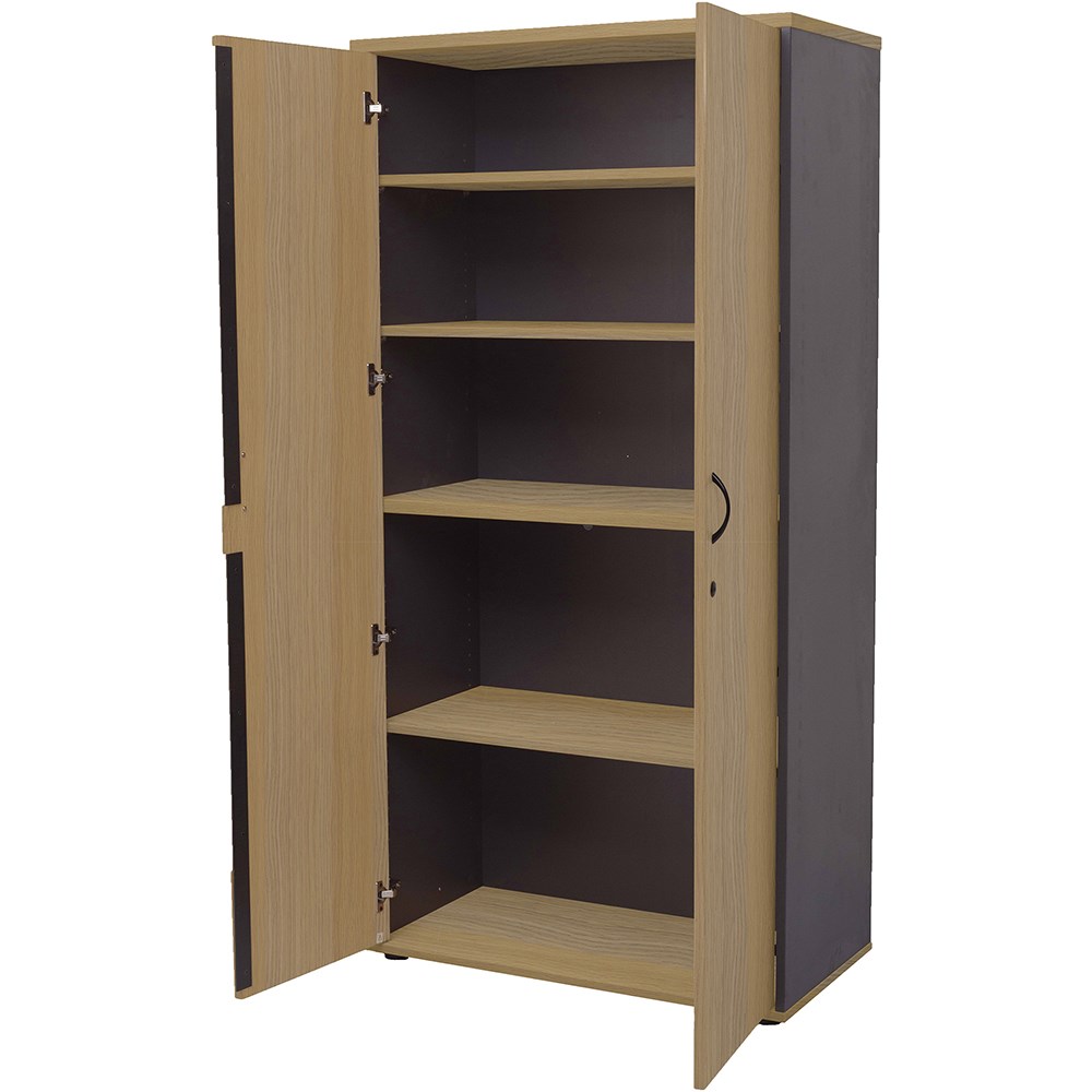 Natural Oak and Ironstone in colour. The Rapid Worker range is constructed of environmentally friendly melamine. The cupboard is fully lockable with 3 adjustable shelves and 1 fixed shelf. Soft close hinges. E0 enviroboard. 5 Year Manufacturer's Warranty.