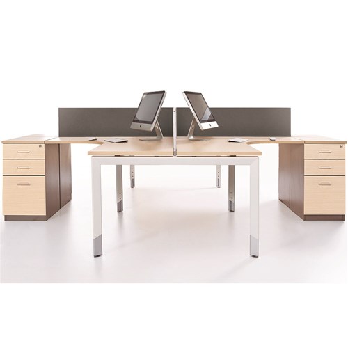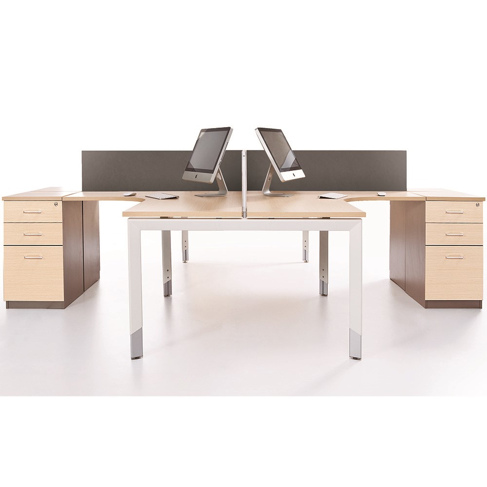 4 Person Corner Workstation Snow Maple top and White frame. Includes 4 x 2 drawer 1 file fixed pedestals. 3000/3000 x 500/600D x 620-920mmH. Convert this collaborative workspace into two private work desks with the addition of divider screens. Height settable legs, this unique design provides ergonomic support by adjusting to you and your colleague's height. 10 Year Manufacturer's Warranty. Delivery, installation and assembly charges may apply to furniture. Please enquire to confirm.