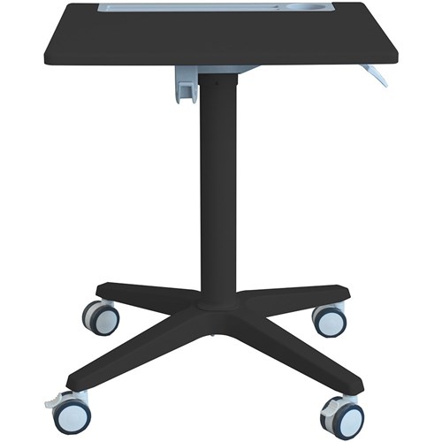 Laptop mobile desk. Black top black frame. Dimensions: 650W x 550D x 700-1150mmH. Round edges with tablet slot to prop up your device and cup holder in grey. Bag hook. Light in weight, with a pneumatic height adjustable system that is quickly released and secured with a single lever allowing the user to easily change postures from sit to stand. Easy glide castors located at the base permit a smooth movement between areas and rooms. Perfect solution to create a flexible work space. 10 Year Manufacturer's Warranty. Delivery, installation and assembly charges may apply to furniture. Please enquire to confirm.