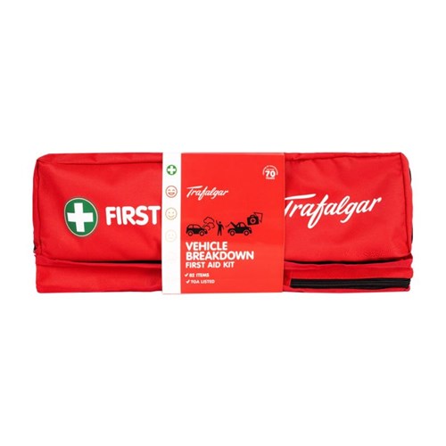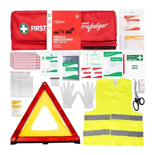 82-Piece Kit includes essential safety items for drivers. Hazard Warning Triangle for visibility during breakdowns. High-Visibility Vest enhances driver visibility in emergencies. Durable Boot Bag secures easily in your car with a Velcro panel. First Aid Supplies provides immediate assistance during vehicle emergencies while waiting for professional help. Contents: 50 x Adhesive First Aid Strips, 1 x Bag Resealable Plastic Small, 1 x Bag Resealable Plastic Medium, 1 x Bandage Conforming 5cm x 1.8m, 1 x Bandage Triangular 110cm x 110cm x 155cm. 2 x Dressing Non-Adherent 10cm x 10cm, 1 x Dressing Wound large, 2 x Eye Dressing Pads, 1 x Face Shield CPR With Valve, 1 x First Aid Quick Reference guide & contents guide. 1 x Gloves Disposable Pair, 1 x Notepad and Pencil, 12 x Safety Pins Assorted, 1 x Safety Triangle, 1 x Safety Vest High Visibility (Yellow), 1 x Scissors, 1 x Tape Hypoallergenic 1.25cm x 9m. 1 x Thermal Rescue Blanket, 2 x Wound Wipes. Always read the labels and follow the directions for use.